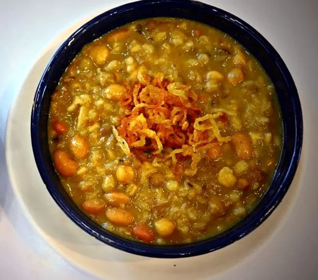 طرز تهیه آش دندونی لذید که کنارش نان سنگک است.