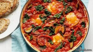فراشپز- برای تهیه “املت تونسی شاک شوکا” ،گوجه فرنگی ها رو پوره کنید تا له شوند . روغن یا کره را گرم کنید و پیاز و فلفل ها رو اضافه کنید و در ماهیتابه رو