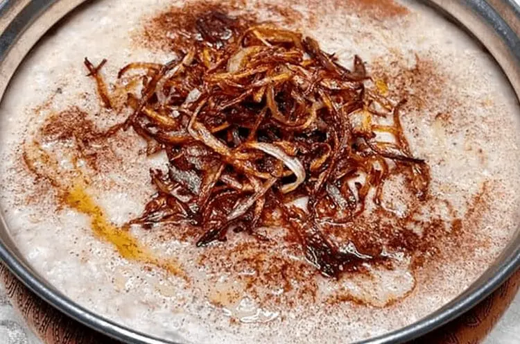 برای تزئین، میتوانید از مغز گردو و پیاز داغ استفاده کنید. این تزئین نه تنها به زیبایی غذا میافزاید، بلکه ترکیب طعمی فوقالعادهای را نیز به آن میبخشد. اکنون حریسه آماده سرو است و میتوانید از این غذای سنتی و بسیار مقوی لذت ببرید.