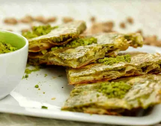 آن را به ۴ تکه برش دهید، روی آن پودر پسته بپاشید و داغ سرو کنید.