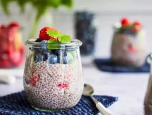 این غذای سالم و خوشمزه از نظر طعم و مزه میتواند هر صبحانه و دسری را شکست دهد و طرز تهیه آن بسیار آسان است. برای تهیه آن، ۲ قاشق غذاخوری دانه چیا که به مدت یک شب خیسانده شده باشد، نصف فنجان شیر بادام شیرین نشده، یک چهارم قاشق چایخوری عصاره وانیل و نصف فنجان شاه توت را اضافه کنید و همه مواد را خوب مخلوط کنید. پودینگ دانه چیا شما آماده است. این پودینگ فقط ۱۷۰ کالری دارد.