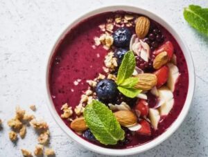 برای تهیه یک کاسه اسموتی، نصف فنجان توت یخ زده، نصف موز، نصف فنجان اسفناج، نصف فنجان شیر بادام شیرین نشده، ۱ قاشق غذاخوری دانه چیا را که به مدت یک شب خیس خورده باشد، ترکیب کنید. همه این مواد را در ظرف مخلوط کن بریزید و آنقدر هم بزنید تا به صورت خمیر اسموتی در بیاید. سپس آن را در یک کاسه یا لیوان خالی کنید و با ۱ قاشق غذاخوری گرانولا و تکههای میوه تازه تزئین کنید و آن را به صورت تازه مصرف کنید. این اسموتی در مجموع ۲۳۰ کالری دارد که میتواند به حفظ سلامتی شما کمک کند.