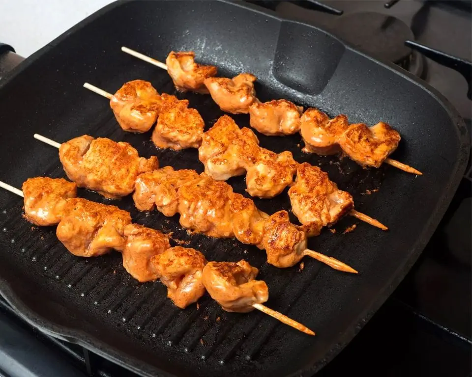 پس از اینکه گوشت مرغ طعم دار شد، آنرا از یخچال خارج می کنیم. حالا سیخ های چوبی را چند دقیقه داخل آب سرد می خیسانیم و داخل هر سیخ ۴ تا ۵ تکه گوشت مرغ قرار می دهیم. یک تابه مناسب روی حرارت متوسط قرار می دهیم.