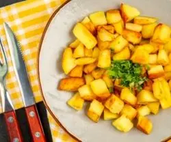 سیب زمینی ها را به صورت مربع مربع خورد کنید و به پیاز ها اضافه کنید.