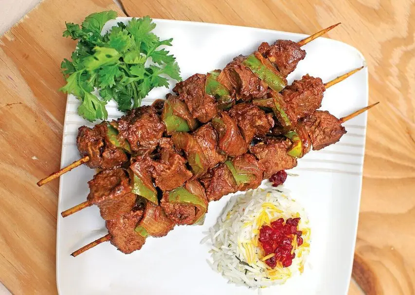 ۶. بعد از پخت، سیخهای چوبی را در ظرف مناسب سرو چیده و سس مانده در ظرف را روی آنها بریزید. این کباب را میتوانید هم با نان و هم با چلو سرو کنید.