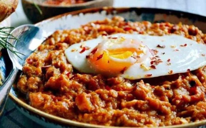 وقتی مواد داخل تابه به روغن افتاد، نوبت اضافه کردن رب گوجه فرنگی می رسد. البته در بسیاری از دستورها استفاده از رب گوجه فرنگی را اختیاری نوشته اند. اگر دوست داشتید می توانید این مورد را حذف کنید. هر چند که بسیاری از افراد از خوش طعم شدن این غذا با رب گوجه فرنگی حکایت کرده اند. در انتها نیز تخم مرغ را اضافه کرده و چاشنی غذا را اندازه می کنیم. این غذا به راحتی جا افتاده و آماده است تا با نان سرو شود.