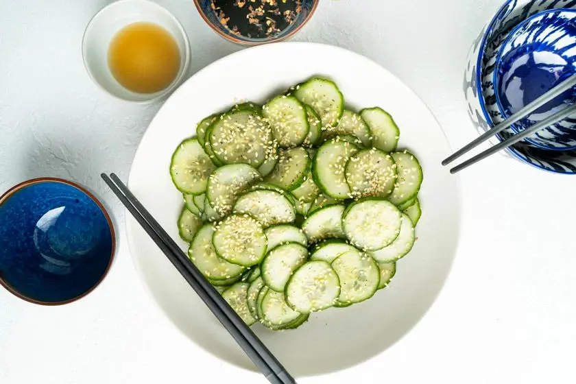 به طور معمول، سالاد خیار و کنجد را با نمک زدن به خیارها تهیه میکنند که به بیرون کشیدن آب اضافی خیارها کمک و خب سالاد را نمکی میکند. برای کاهش میزان نمک در این غذا، آن مرحله را نادیده گرفتیم و به جای آن، طعم سس را با سرکه برنج، روغن کنجد برشته شده، زنجبیل و سیر بهبود دادیم. شکر را نیز در این سالاد کمتر استفاده کنید و حتی اگر به طعم سسهای ملس علاقه ندارید، میتوانید آن را از مواد اولیه حذف کنید.