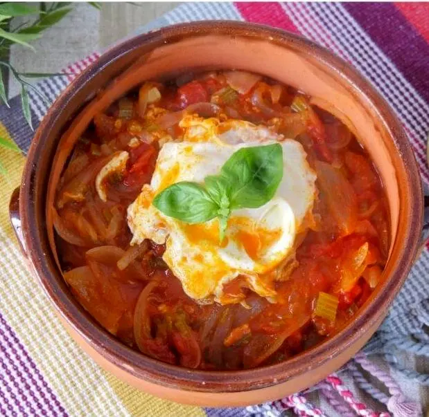 حالا دو عدد تخم مرغ را با فاصله درون قابلمه بشکنید، به هیچ وجه تخم مرغ ها را هم نزنید اجازه دهید مواد درون قابلمه به همان حالت بماند تا تخم مرغ ها کاملا پخته و بسته شوند.