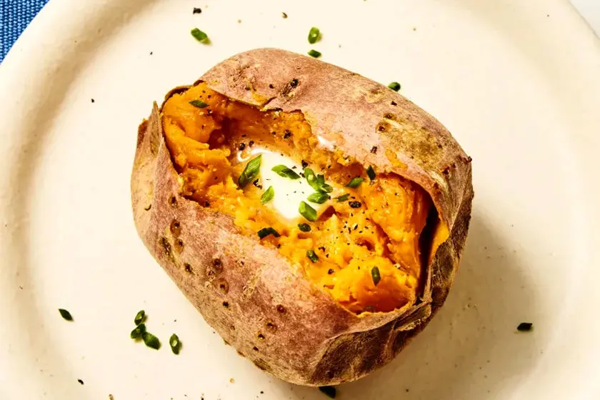 سیبزمینی شیرین سرشار از بتاکاروتن است که خاصیت ضدالتهابی دارد و همچنین منبعی غنی از فیبر مفید برای سلامت گوارش به شمار میآید. همین که آن را با کرهی نرم، پیازچه و کمی فلفل سیاه میل کنید، یک وعده ساده و سالم در اختیار دارید.