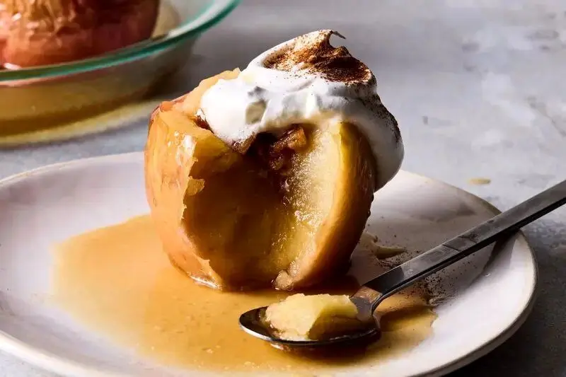 بعد از اینکه سیبها کاملا خنک شد، میتوانید روی آنها را با خامه فرم گرفته یا هر نوع کرم شیرین و مربا تزیین کنید.